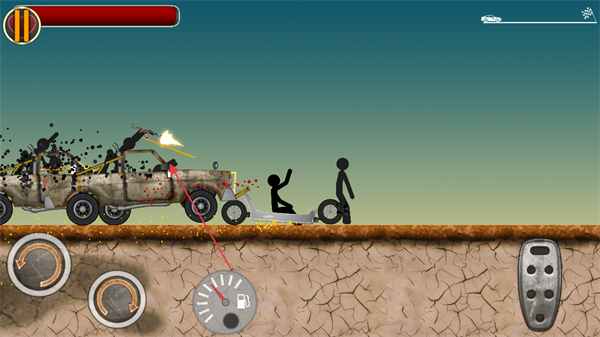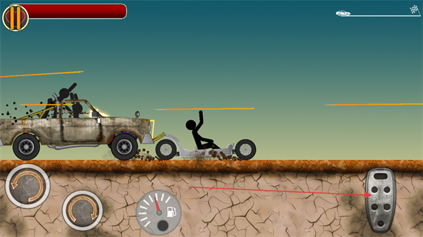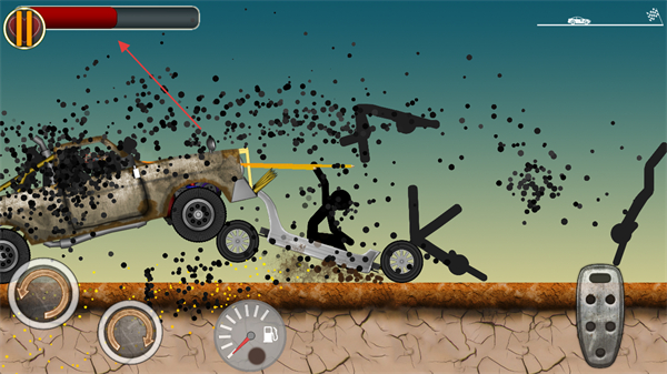 1、進(jìn)入游戲界面,利用屏幕右側(cè)按鈕操控火柴人駕駛的車輛,注意觀察上方血條。