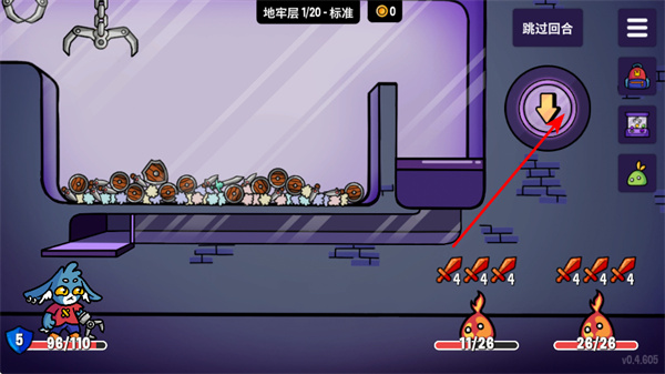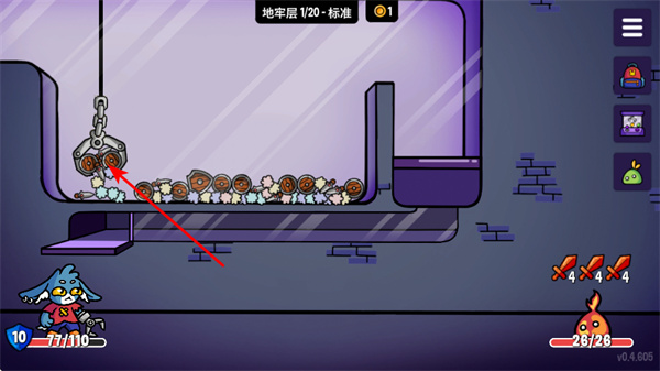 2、釋放鉤爪,點擊右側向下箭頭按鈕,來釋放鉤爪抓取地牢中的物品,積累資源和金幣。