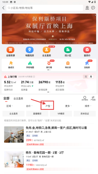 2、在二手房查詢頁(yè)面,點(diǎn)擊戶型選項(xiàng),選擇一居戶型。