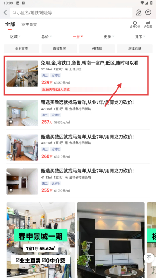 4、在列表中,找到免傭金,地鐵口急售,朝南一室戶,隨時(shí)可以看房源條目¥67792/㎡及相關(guān)信息。
