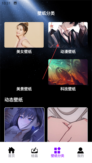 2、在壁紙分類(lèi)頁(yè)面,選擇動(dòng)漫壁紙,進(jìn)入動(dòng)漫壁紙頁(yè)面。