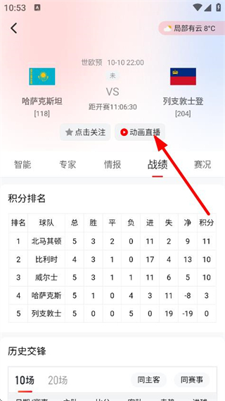 3、在比賽詳情頁面,點擊動畫直播,可觀看比賽動畫直播。