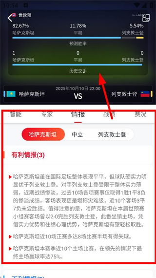 4、在比賽詳情頁面,可查看比賽相關(guān)情報,如有利情報等。