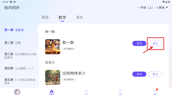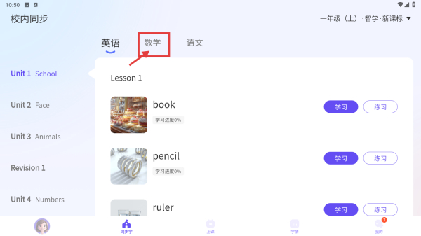 2、在校內(nèi)同步頁面,點(diǎn)擊數(shù)學(xué)科目選項(xiàng),切換到數(shù)學(xué)學(xué)習(xí)板塊。