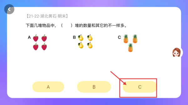 4、在題目練習(xí)中,分析各選項(xiàng)數(shù)量:A堆有4個(gè)草莓,B堆有4個(gè)梨,C堆有3個(gè)菠蘿,因此數(shù)量不同的是C堆,選擇答案C。