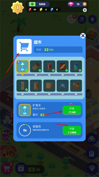 1、可經(jīng)營(yíng)超市,在超市界面,能對(duì)商品和收銀員進(jìn)行升級(jí)。升級(jí)礦泉水需花費(fèi)60貨幣,升級(jí)后可增加收入;升級(jí)收銀員花費(fèi)1500貨幣,能縮短結(jié)賬時(shí)間,提升超市運(yùn)營(yíng)效率。