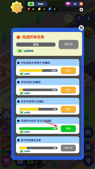 2、存在任務(wù)系統(tǒng),需要完成一系列任務(wù),如將超速警車(chē)升級(jí)至10級(jí)、安檢機(jī)升至10級(jí)、將來(lái)賓車(chē)升至2級(jí)、將超市中的礦泉水升至3級(jí)、超市購(gòu)物5名旅客等。