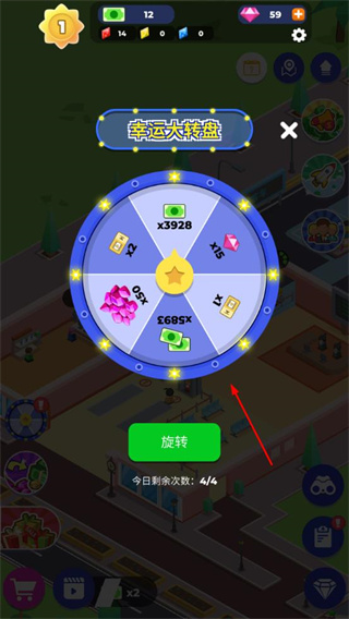 3、有幸運(yùn)大轉(zhuǎn)盤(pán)玩法,每日有剩余次數(shù),點(diǎn)擊旋轉(zhuǎn)轉(zhuǎn)盤(pán),有機(jī)會(huì)獲得金幣、鉆石、道具等獎(jiǎng)勵(lì),助力游戲進(jìn)程。