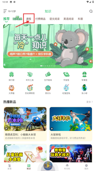 1、打開兒童教育類應(yīng)用,點(diǎn)擊底部知識(shí)選項(xiàng),進(jìn)入知識(shí)板塊頁面。