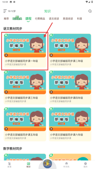2、在知識(shí)板塊頁面,點(diǎn)擊課程分類標(biāo)簽,切換到課程列表界面。