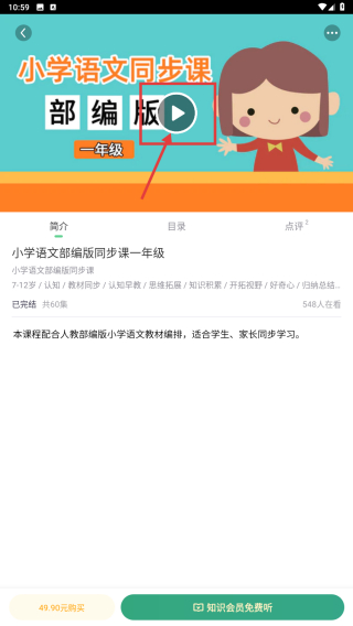 4、在課程詳情頁,點(diǎn)擊播放按鈕,開始學(xué)習(xí)小學(xué)語文部編版一年級(jí)同步課程。