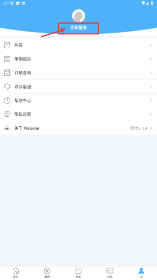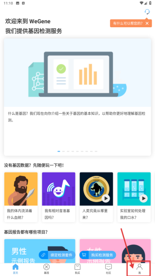 1、打開(kāi)WeGene應(yīng)用,點(diǎn)擊底部我選項(xiàng),進(jìn)入個(gè)人中心頁(yè)面。