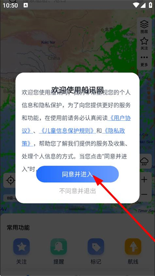 1、彈出的歡迎使用船訊網(wǎng)提示框中,點擊同意并進入,即可進入軟件。