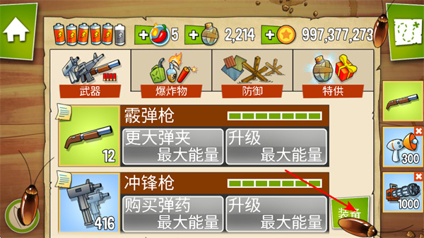 3、升級武器,在武器界面中對沖鋒槍等武器進行升級,點擊裝備按鈕,從而獲取經(jīng)驗升級。