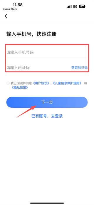 4、在賬號(hào)注冊(cè)頁面,輸入手機(jī)號(hào)碼,獲取并輸入驗(yàn)證碼后點(diǎn)擊下一步按鈕,完成賬號(hào)注冊(cè)操作。