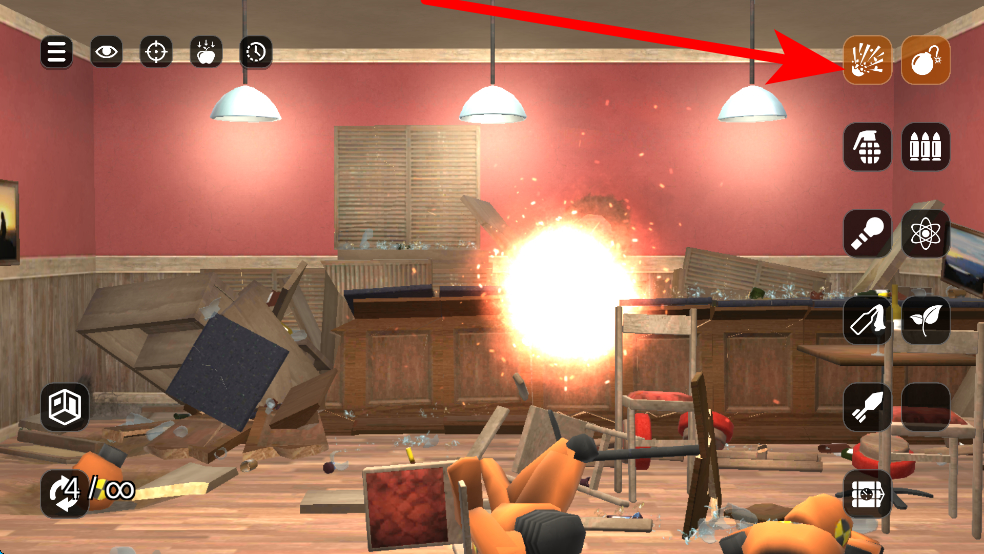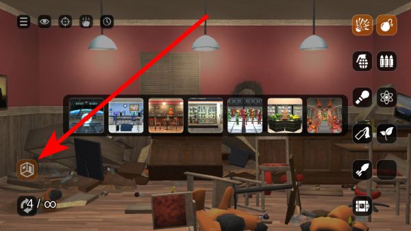 2、在場景中,右側會有手雷、炸彈等各類破壞道具,點擊選擇相應道具,然后瞄準房間內(nèi)的物品,如酒柜、桌椅等,釋放道具進行爆破粉碎。