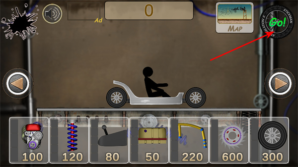 1、啟動(dòng)游戲,點(diǎn)擊界面右上角的Go按鈕,進(jìn)入火柴人駕車的破壞挑戰(zhàn)環(huán)節(jié)。