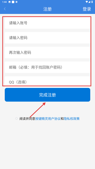 4、在注冊頁面,依次填寫賬號、密碼、再次輸入密碼、郵箱點擊完成注冊按鈕,完成賬號注冊操作。