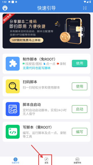 1、打開腳本工具類應(yīng)用,點(diǎn)擊底部發(fā)現(xiàn)選項(xiàng),進(jìn)入發(fā)現(xiàn)頁(yè)面。
