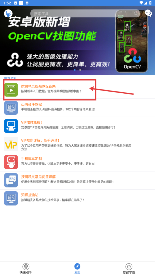 2、在發(fā)現(xiàn)頁(yè)面,點(diǎn)擊按鍵精靈視頻教程合集條目,進(jìn)入教程列表頁(yè)面。