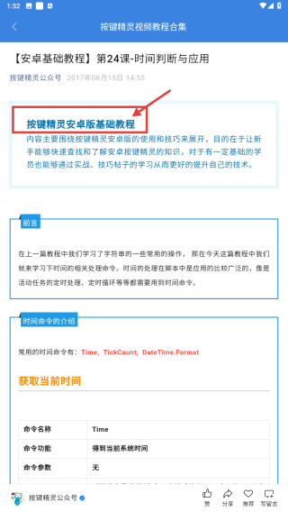 4、在教程詳情頁(yè),查看關(guān)于按鍵精靈安卓版時(shí)間判斷命令的專業(yè)講解,內(nèi)容涵蓋Time命令獲取當(dāng)前系統(tǒng)時(shí)間等時(shí)間判斷相關(guān)知識(shí)及應(yīng)用。
