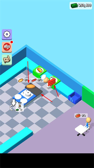 2、廚師需要到食材區(qū)域獲取食材如香腸等,然后進行加工制作,制作完成后,將食物送到顧客所在的餐桌前。