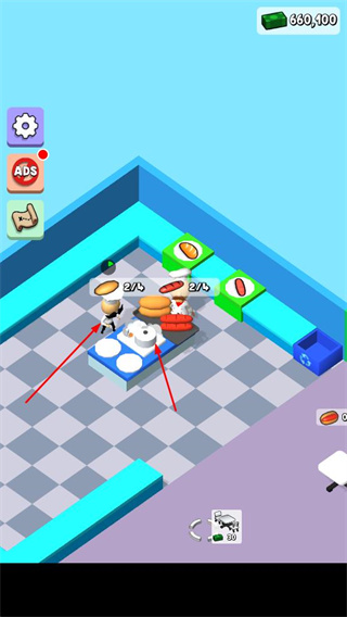 1、玩家操控廚師角色在餐廳內(nèi)移動可向多個方向移動,目的是為顧客制作并提供食物。