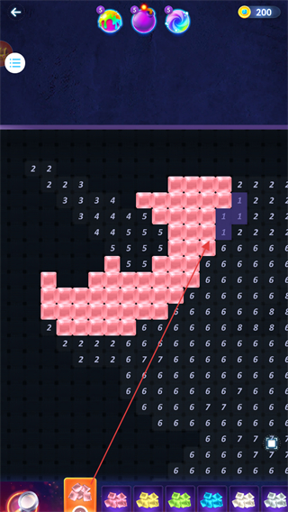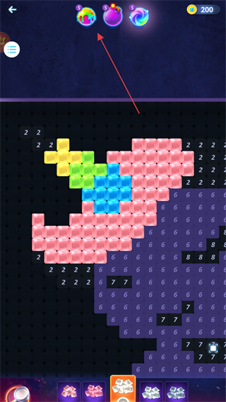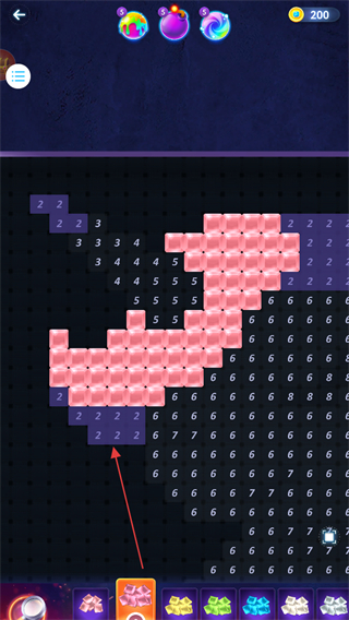 1、進(jìn)入游戲,觀察界面中粉色的寶石方陣,以及方陣旁標(biāo)注的數(shù)字,這些數(shù)字代表對應(yīng)行列需要消除的寶石數(shù)量。