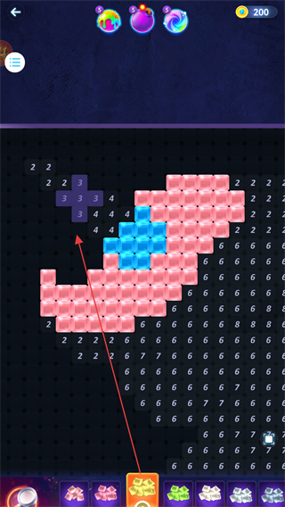 2、點(diǎn)擊下方不同顏色的寶石,如紫色、橙色等,放置到方陣中,使同色寶石相連,當(dāng)相連同色寶石數(shù)量達(dá)到或超過旁邊標(biāo)注數(shù)字時(shí),即可消除這些寶石。