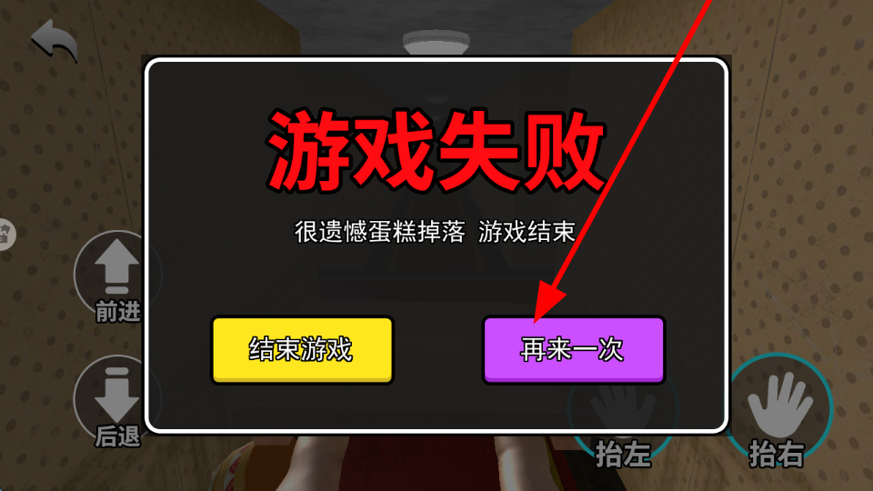 4、失敗重來(lái),若蛋糕掉落導(dǎo)致游戲失敗,點(diǎn)擊再來(lái)一次按鈕,重新開始游戲,再次嘗試成功運(yùn)送蛋糕。