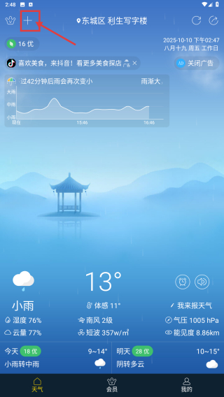 1、打開天氣類應(yīng)用,點擊左上角+號圖標(biāo),進入城市管理頁面。