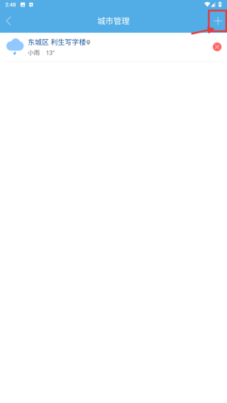 2、在城市管理頁面,點擊右上角+號圖標(biāo),進入添加城市頁面。