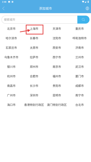 3、在添加城市頁面,選擇上海市,完成城市添加操作。