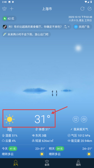 4、查看上海市天氣信息,顯示為晴,氣溫31°,濕度51%,東風(fēng)3級。