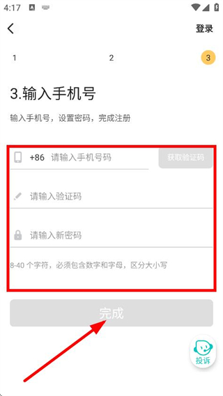 4、在注冊頁面,輸入手機號碼、驗證碼和新密碼后,點擊完成,完成注冊操作。