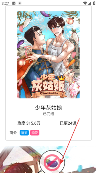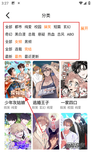 2、在分類頁面,篩選出喜歡的漫畫類型后,點擊少年灰姑娘漫畫,進入漫畫詳情頁面。