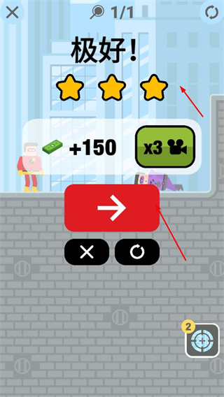 3、成功完成任務后,會獲得獎勵,如金幣,還會有星級評價,同時可選擇繼續(xù)游戲或觀看視頻獲取額外獎勵。