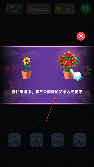 1、進入游戲,依照提示按住花朵,將三朵相同花朵合成花束,熟悉合成操作。