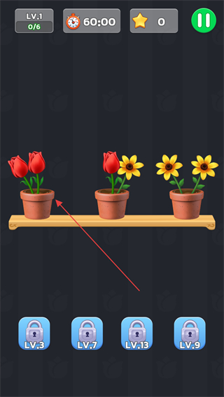 2、游戲開始,在架子上找到相同種類花朵,點擊拖動進行排列,準備合成更高等級花朵。