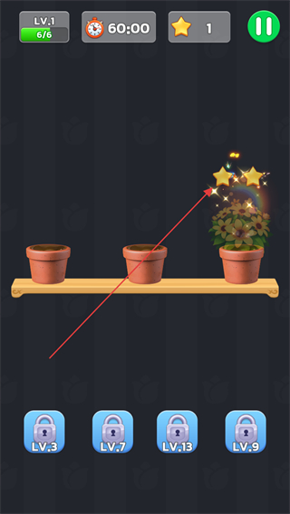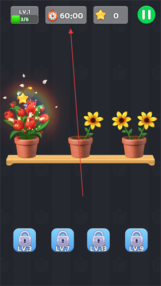 4、合成特殊或高等級花朵時,會出現(xiàn)特效,同時獲得星星獎勵,用于解鎖下方LV.3等關(guān)卡。