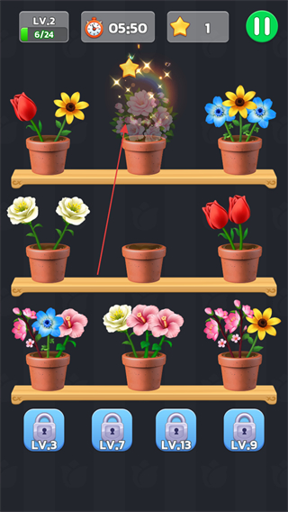 1、留意屏幕上方等級(jí)LV.2、倒計(jì)時(shí)05:50和星星數(shù)量,找到三朵相同花朵進(jìn)行合成獲取星星。