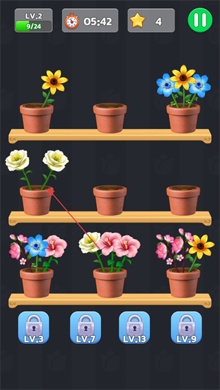 初期關(guān)卡僅需簡(jiǎn)單三花連線,后續(xù)逐步加入“固定花朵”“多色搭配”等限制,難度緩慢提升,避免新手因挑戰(zhàn)過(guò)高而放棄。