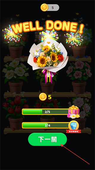 4、當(dāng)進(jìn)度條達(dá)到要求,且獲得足夠星星完成關(guān)卡目標(biāo),點(diǎn)擊下一關(guān)進(jìn)入下一關(guān)游戲。