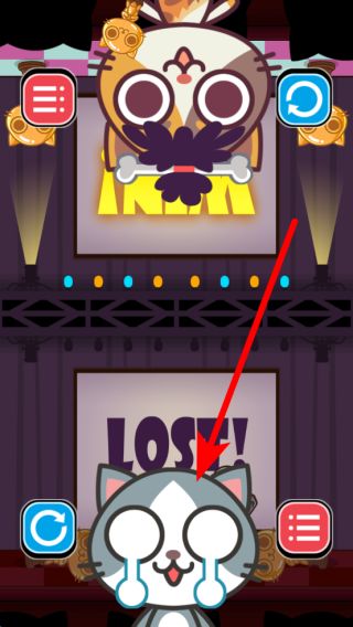 4、當(dāng)成功對對手貓咪造成有效打擊,使其處于不利狀態(tài)時,可進一步推進對戰(zhàn)節(jié)奏,爭取獲得勝利,若失敗則會出現(xiàn)失敗提示畫面。