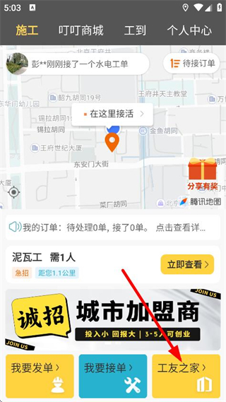 2、在軟件主界面,點擊工友之家,進入工友之家頁面。