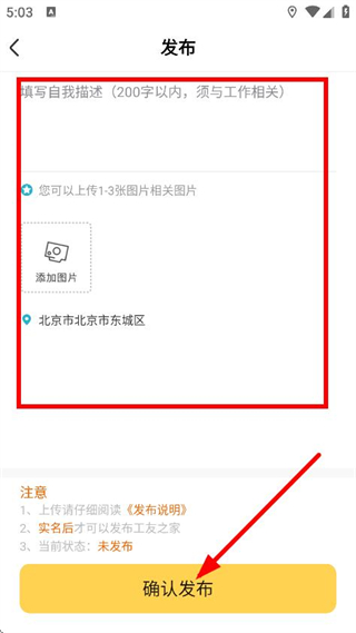 4、在發(fā)布頁面,填寫自我描述、上傳相關(guān)圖片后,點擊確認(rèn)發(fā)布,完成發(fā)布操作。