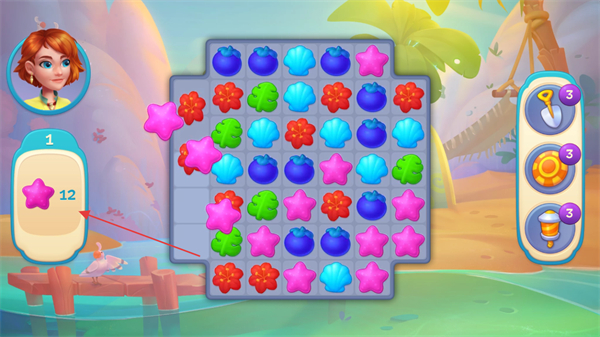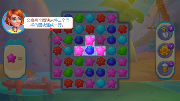 1、根據(jù)提示,交換兩個圖塊,使三個同樣的圖塊連成一行進(jìn)行消除,留意左側(cè)目標(biāo)粉色星星15個。