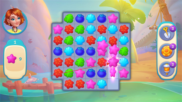 3、成功消除同色相連圖塊,持續(xù)降低目標(biāo)數(shù)量,如粉色星星9個,獲取分?jǐn)?shù)。