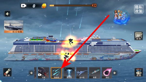 1、進(jìn)入游戲后,在下方武器欄中,可選擇如暴風(fēng)雨這類武器,點(diǎn)擊后對目標(biāo)戰(zhàn)艦釋放,造成傷害,推進(jìn)戰(zhàn)斗進(jìn)程。