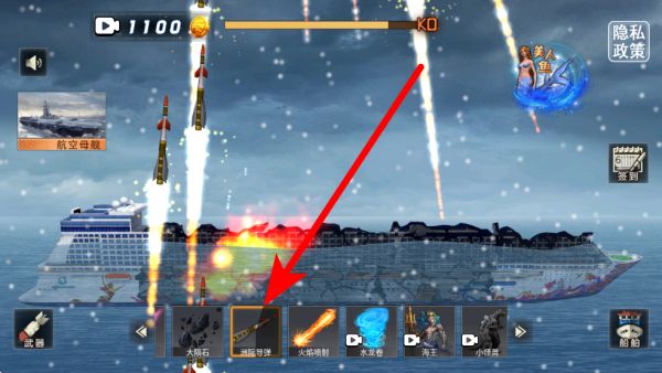 3、洲際導(dǎo)彈也是強(qiáng)力武器之一,點(diǎn)擊選擇該武器并釋放,能對目標(biāo)戰(zhàn)艦造成大量傷害,加快戰(zhàn)斗勝利的節(jié)奏。